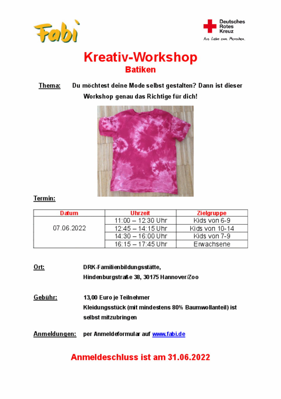 | Tag | Termin | Uhrzeit | Kursdauer | Kursgebühr | Anmeldung |